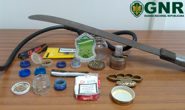 A ação envolveu uma busca domiciliária que permitiu apreender 23 doses de haxixe, uma caixa de sementes de cannabis, diverso material associado ao consumo de estupefacientes, uma catana e uma soqueira.