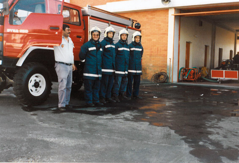 Os bombeiros José de Jesus Cardoso, Carlos Ribeiro, Vítor Eloy, Tiago Catrola Raposeira e António Nunes, nos anos 90.